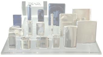 Display Stands We also have available clear Lucite display stands that will highlight and simplify the merchandising of your Pearl Tsubota products. These displays are custom made for Pearl Tsubota and have a frosted base, riser area, and a beautiful Pearl logo monogrammed block in clear and frosted Lucite. Also included are clear stands for displaying the products on the base of the platform. These compact stands fit in showcase towers and counter cases for clean organization and security. Even this small accessory makes a big difference in drawing customers’ attention. |